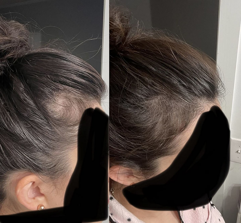 "After becoming a mum, I struggled with losing my hairline and spent months trying different products to encourage regrowth. When I came across the Bello Hair Growth Shampoo and read all the positive experiences, I decided to give it a shot. I started the challenge in early May 2024, and after just 4 weeks of consistently following the program twice a day, I can already see a big difference — my hairline on both sides looks noticeably fuller! While it's still early in my journey, I'm confident that with a few more months of staying committed to the challenge, I'll see even more amazing results. Sharing my before and after photos after 4 weeks – I'm so excited for what's ahead!"
